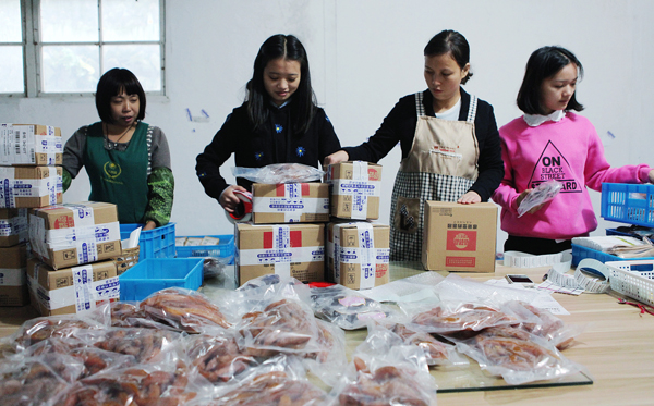 “双十一”网络购物节即将到来,我县网商们也都积极备好足够的货源,迎接“双十一”。图为金山林海特产店的员工们在备货。