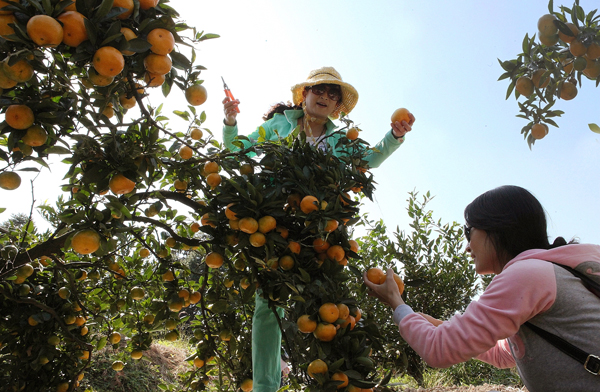 游客在采摘蜜桔。日前,湖山乡龙珠岗柑桔场60多亩蜜桔全面成熟。龙珠岗柑桔场一直以提高产品质量为目的,采用生草栽培、割草覆盖、埋草改土等技术,使蜜桔质量大幅度提升,并在省、市柑桔质量评比中屡获佳绩。