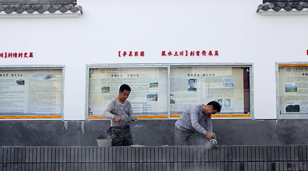 目前,金竹镇王川村文化礼堂建设进入扫尾阶段,预计在12月初投入使用。据悉,今年我县计划新建14家文化礼堂,截至目前,已有50家投入使用,文化礼堂成了农村群众的精神家园。图为工人们在建设王川村文化礼堂门前花坛。