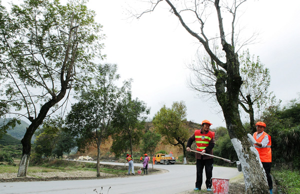 行道树刷白“暖”过冬。连日来,县公路局开展县内公路两旁行道树刷白作业,此举不仅可以保护树木,防止日灼,而且有效杀灭病虫害滋生体,同时起到美观的视觉效果,为车辆提供了舒适的运行环境。