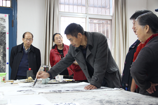 为了让学员们更好地掌握创作技巧,近年来,县老年大学书画班将课堂“延伸”到各中小学,图为学员们与遂昌三中的美术老师进行交流创作。
