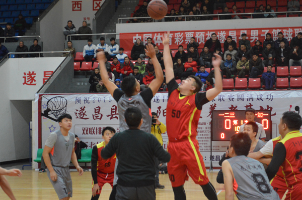 今晚,我县2015“体彩杯”男子篮球联赛正式开赛。据悉,本次比赛共有27支代表队参加,是展示我县篮球爱好者风采和篮球竞技水平的重要平台。图为揭幕战开球现场。