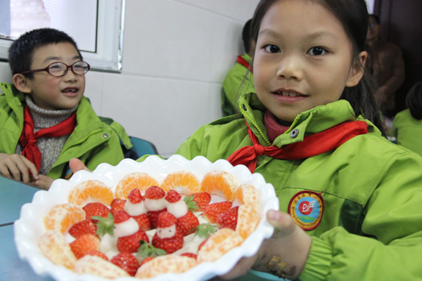 日前,县实验小学开展开心水果乐园活动,组织学生自己动手制作水果拼盘,培养学生的动手能力和想像力。图为学生展示制作的水果拼盘。