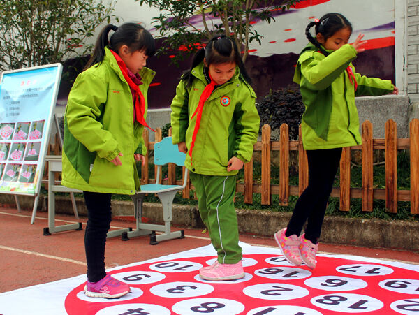 为庆祝元旦,促进学生主动发展、健康成长,昨日,县实验小学开启体育节系列活动。图为学生参加体育节的跳数字游戏。