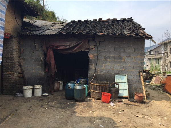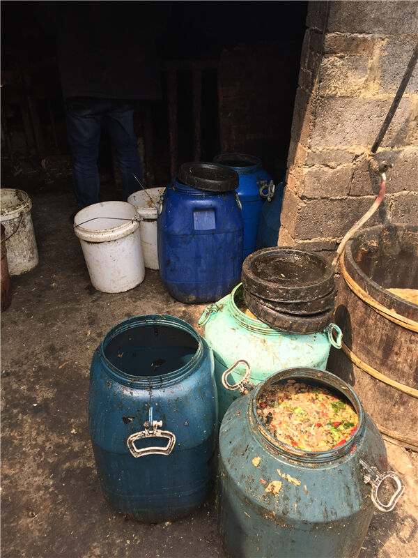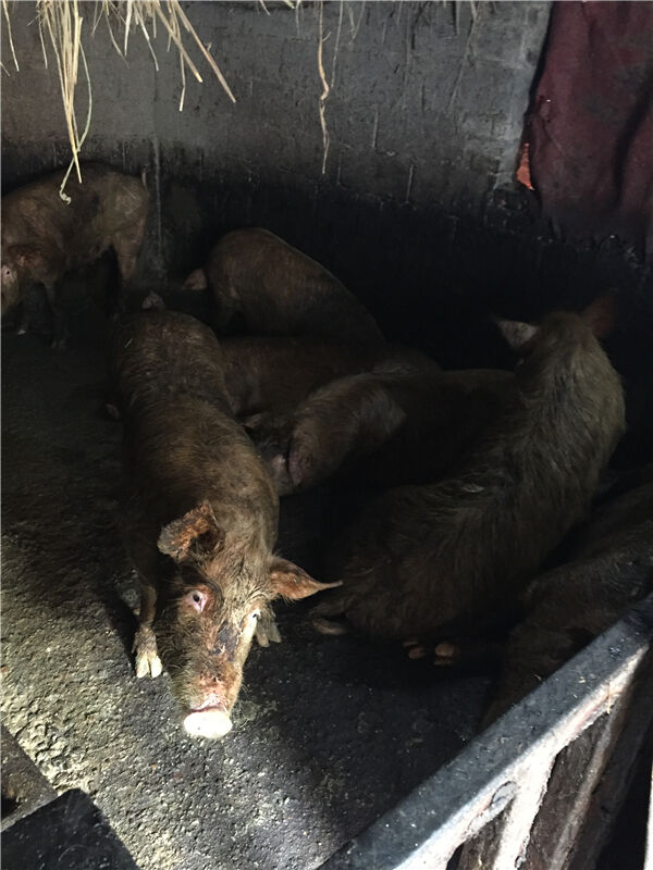 在现场,记者看到泥墙房旁搭建了一个不大的猪栏,里面养了十几头猪,散发着恶臭,猪栏里的白猪已成为了“黑”猪,而猪栏门旁则乱七八糟地堆放着十多个泔水桶,猪栏边的山坡有一根十几米的排污管,一直通到山脚下。