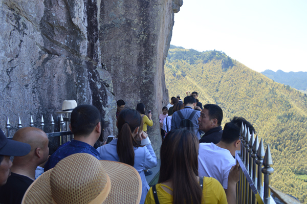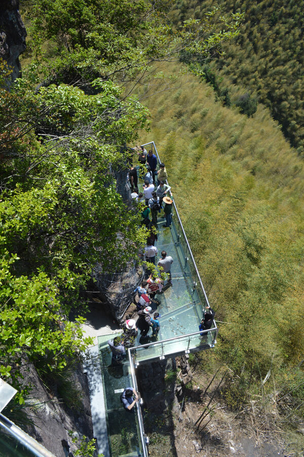 据悉,该栈道全长100米,宽1.2米,由110余块钢化夹胶玻璃组建而成,距地面垂直高度35米,单点承重力超过1000公斤。“景区内通天峡的石阶较窄,所以需要在文笔峰另辟栈道分散客流。”县旅游发展股份有限公司总经理俞伟军说,考虑到景观性和体验性,他们选择以玻璃栈道的形式呈现,没想到吸引了不少慕名而来的外地游客。