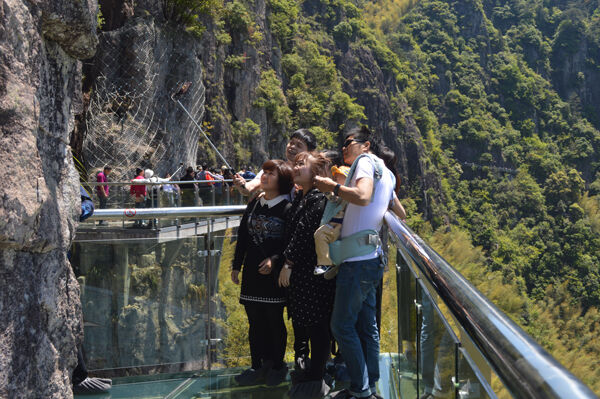 本网5月3日讯 刚刚过去的“五一”小长假,全市首条玻璃栈道在我县南尖岩景区正式对外开放,全透明的高空环崖峰式观景体验引来游人如织,客流量突破万人,较去年翻了一番。