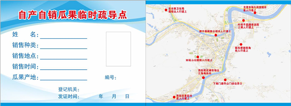 但值得注意的是,果农在前往疏导点免费摆卖前,需去瓜果种植所在地的村委会开具证明,并向县综合行政执法局妙高中队提交申请,通过执法队员实地勘察证实备案后,领取《自产自销瓜果临时疏导点许可证》。