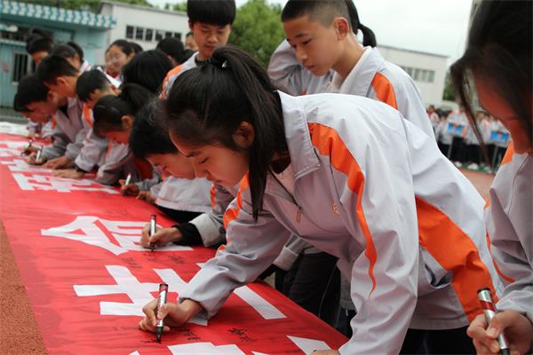 近日,随着气温不断升高,全县中小学、幼儿园以“家校联动,珍爱生命,预防溺水”为主题,陆续开展了形式多样的防溺水专题宣传教育,保障学生生命安全,确保校园安全稳定。图为遂昌三中全校师生和家长代表在安全警示横幅上签名。